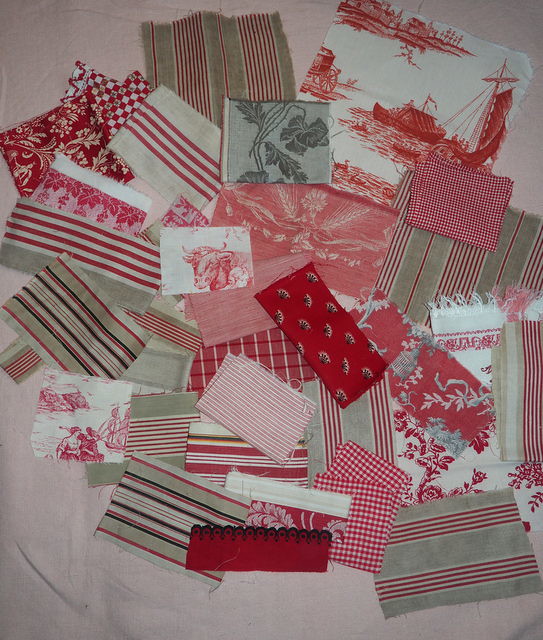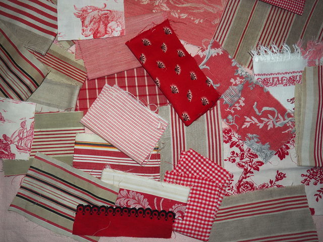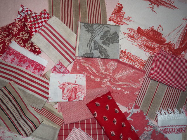 ce lot est particulier , il est composé de tissus anciens à dominance rouge , dont une partie de toiles à matelas anciennes